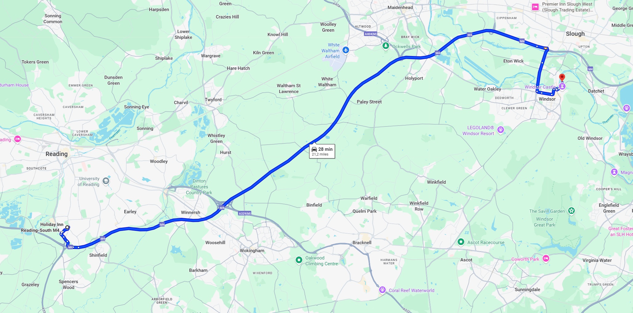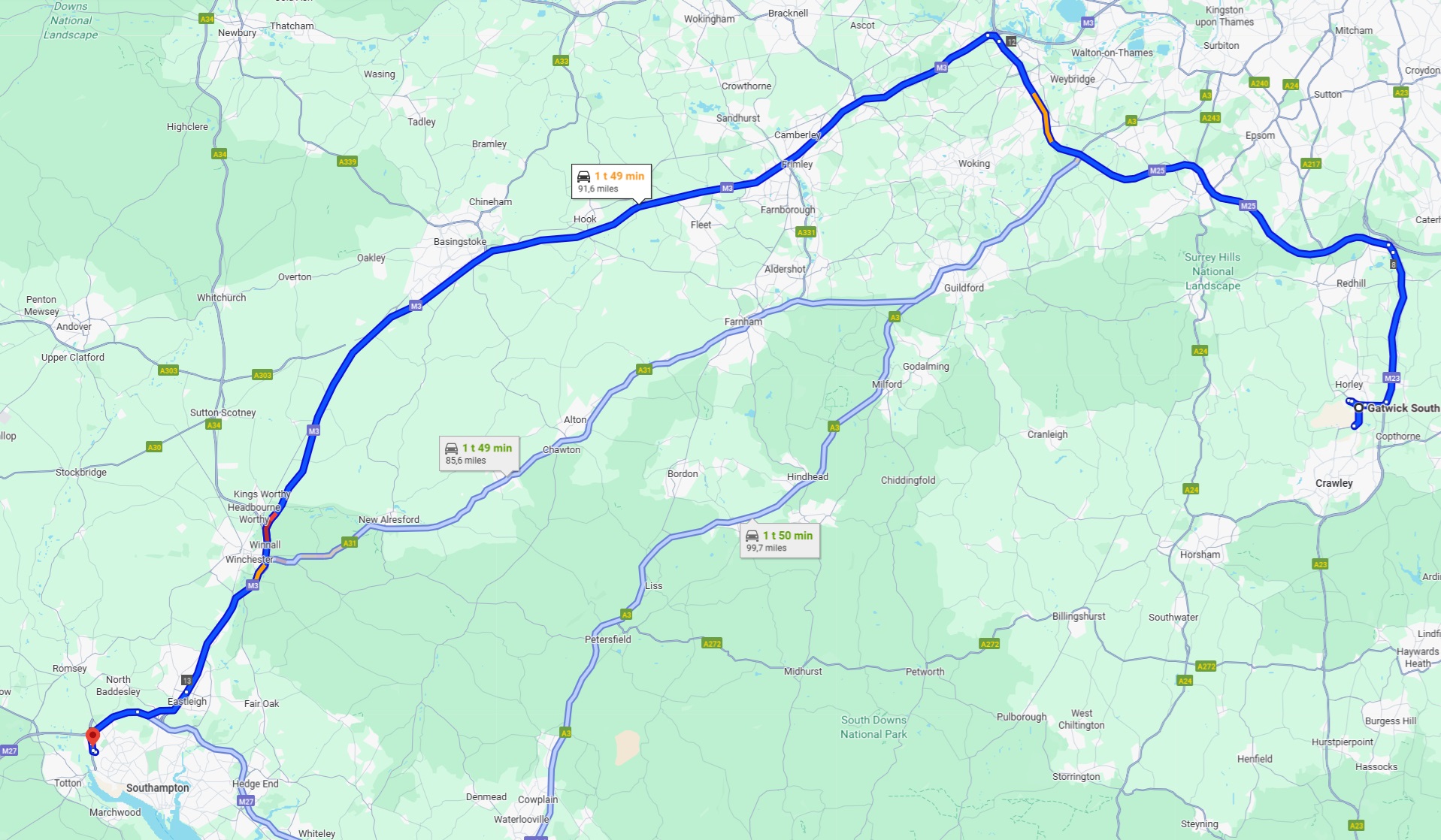 Akkurat 14:30 lokal tid satte vi føttene på britisk jord. Det var en lettelse å konstatere at ETA-søknadene var i orden og at vi kunne begynne ferien vår. Vi fant raskt fram til Enterprise bilutleie. Bilen vi egentlig skulle ha hadde en skrue i dekket, så vi fikk en gratis oppgradering av leiebil til en sort Citroën C5 Aircross. Vi kom raskt igang med kjøreturen til Southampton på M25, M23, M3 og M27. Kunne svingt av til Windsor castle, men valgte å fortsette til vi parkerte på p-plassen til Holiday Inn Express Southampton.