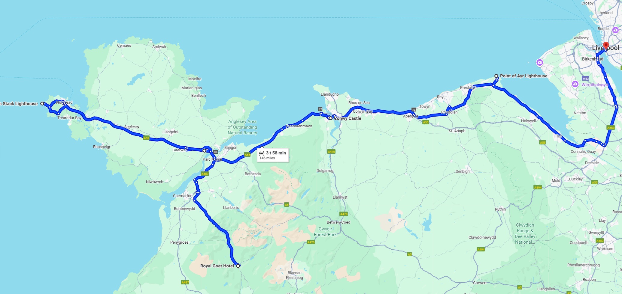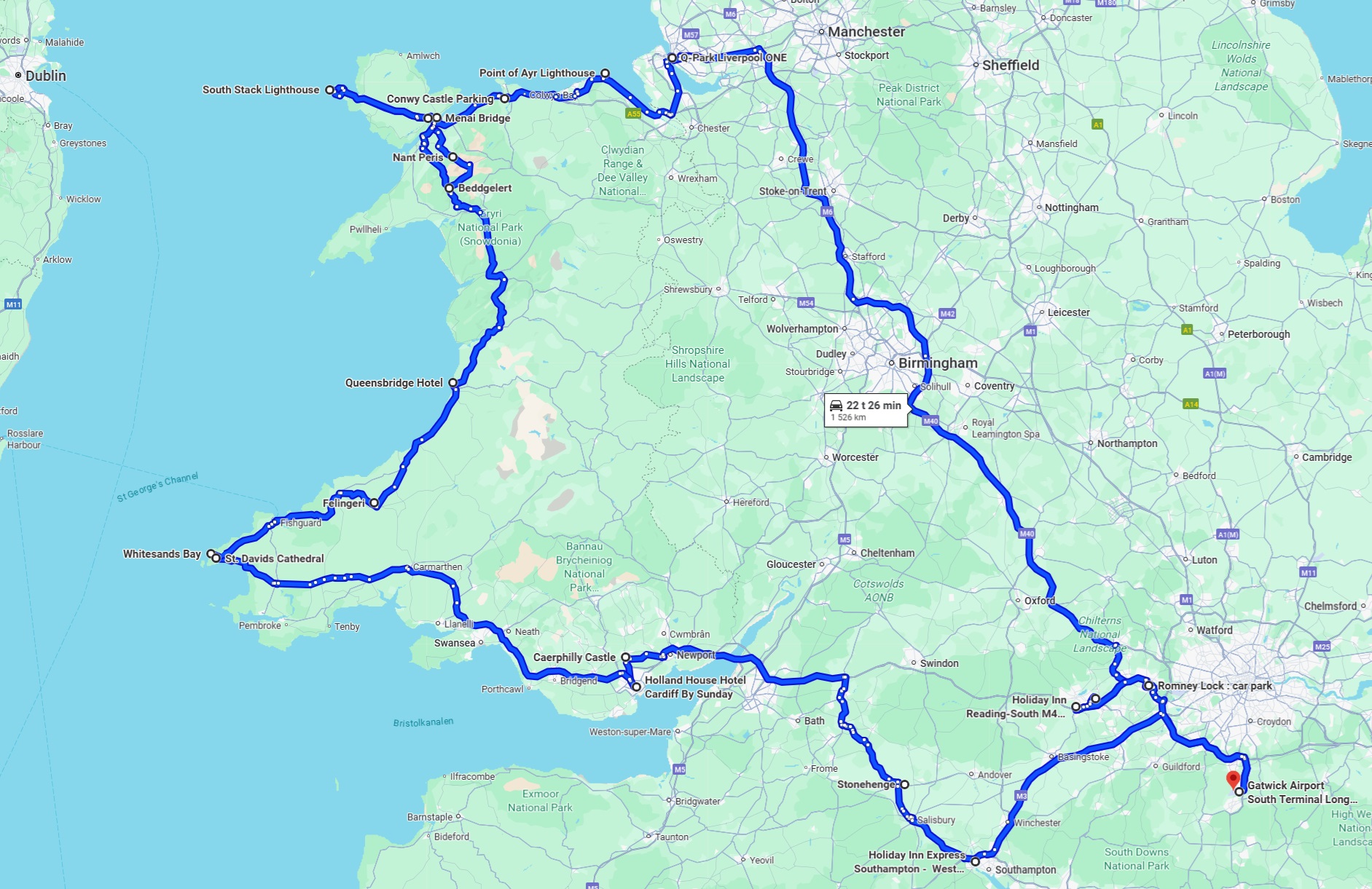 Wales Tour ChroniclesEpoke - søndag 3. august 2025Avreise og SouthamptonDagbok - søndag 3. august 2025Southampton, fra hotellet til sentrumAktivitet - 18:48:13 søndag 3. august 2025StonehengeDagbok - mandag 4. august 2025Caerphilly Castle og CardiffDagbok - mandag 4. august 2025StonehengeAktivitet - 12:04:35 mandag 4. august 2025CaerphillyAktivitet - 17:16:48 mandag 4. august 2025CardiffAktivitet - 20:13:53 mandag 4. august 2025Kysten fra Cardiff til AberystwythDagbok - tirsdag 5. august 2025Benstrekk på Newgale BayAktivitet - 14:18:21 tirsdag 5. august 2025Rusletur i St DavidsAktivitet - 14:48:58 tirsdag 5. august 2025Rast på Fishguard FortAktivitet - 16:18:25 tirsdag 5. august 2025Felin Geri DiscgolfAktivitet - 17:36:47 tirsdag 5. august 2025Kveldstur i AberystwythAktivitet - 20:52:19 tirsdag 5. august 2025Yr Wyddfa, SnowdonDagbok - onsdag 6. august 2025De to høyeste i Wales, Yr Wyddfa (Snowdon) og Garnedd UgainAktivitet - 12:23:15 onsdag 6. august 2025Yr Wyddfa (Snowdon) - 12:23:15 onsdag 6. august 2025Garnedd Ugain - 12:23:15 onsdag 6. august 2025Rusletur BeddgelertAktivitet - 20:03:22 onsdag 6. august 2025Sightseeing i nordDagbok - torsdag 7. august 2025Rusletur South Stack LighthouseAktivitet - 13:00:42 torsdag 7. august 2025Rusletur ConwyAktivitet - 14:46:19 torsdag 7. august 2025Rusletur Point of Ayr LighthouseAktivitet - 18:17:33 torsdag 7. august 2025Sightseeing i LiverpoolDagbok - fredag 8. august 2025Sightseeing LiverpoolAktivitet - 12:00:32 fredag 8. august 2025Dinton Pastures Country Park, ReadingDagbok - lørdag 9. august 2025Dinton Pastures Country Park, ReadingAktivitet - 12:19:25 lørdag 9. august 2025Windsor Castle og hjemreiseDagbok - søndag 10. august 2025The ReturnDagbok - søndag 10. august 2025WindsorAktivitet - 10:56:37 søndag 10. august 2025HorleyAktivitet - 16:10:30 søndag 10. august 2025
