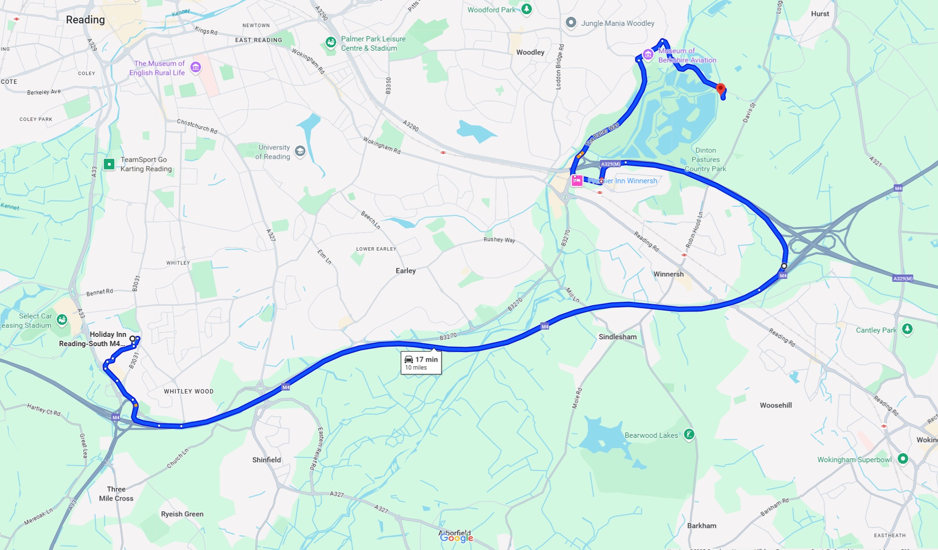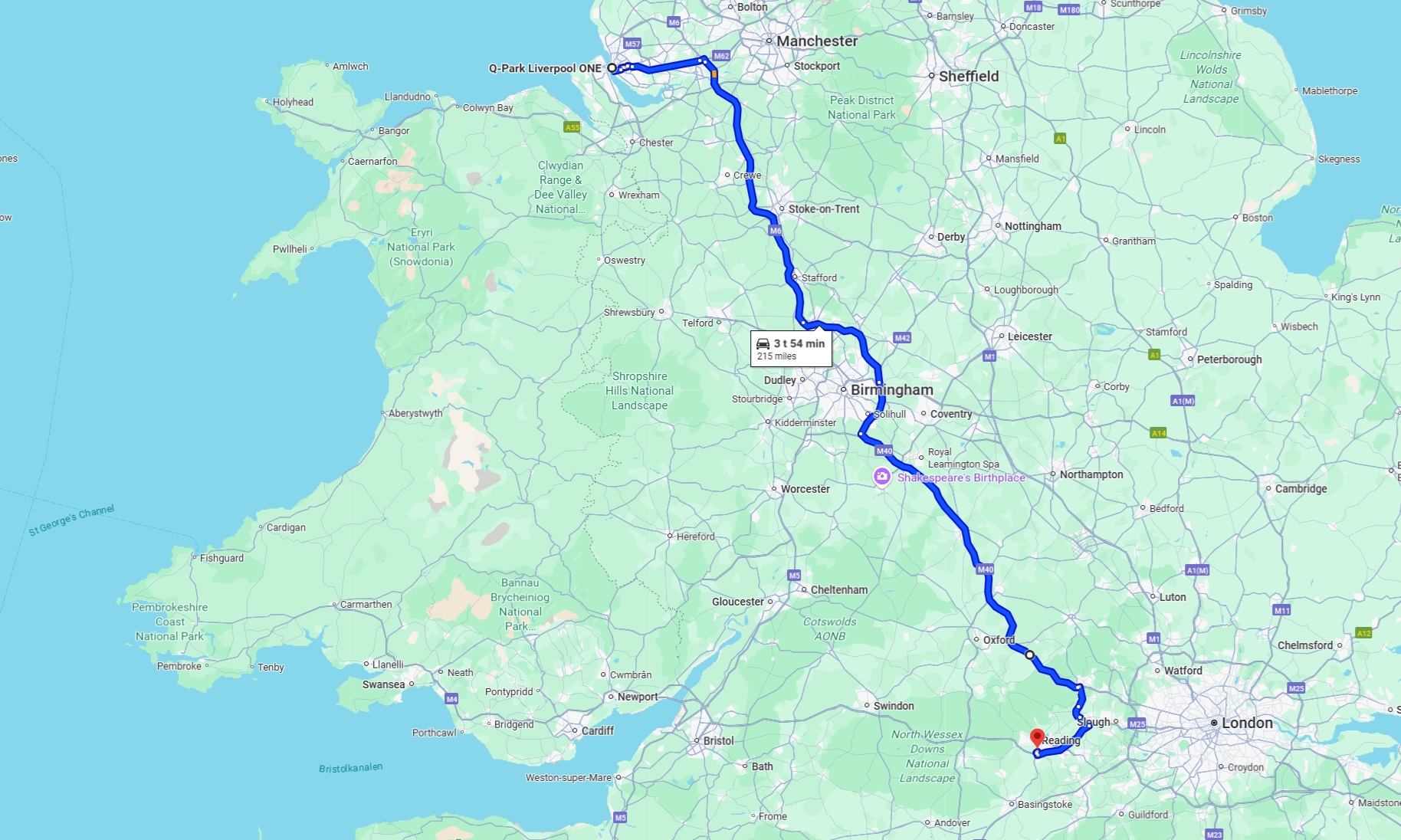 Etterpå gikk vi til parkeringshuset og hentet bilen. Foran oss hadde vi fire hundre kilometer og fire timer i bil fra Liverpool til Reading. Turen gikk fint, det var godt vær og gode kjøreforhold. Vi gikk fra åtte felt til seks og til det minste på fire felt. Hadde kun en kort benstrekk med dieselfylling før vi 21:30 var framme ved hotellet. Vi sjekket inn i en fei etter en hårfin parkering, løp i en labyrint av hotellganger, kastet bagasjen på rommet og spurtet til Lidl som stengte 22. 21:58 kom vi ut derfra med hver vår fangst av varierende sunnhetsgrad. Etterpå gikk vi rett inn på hotellrommet.