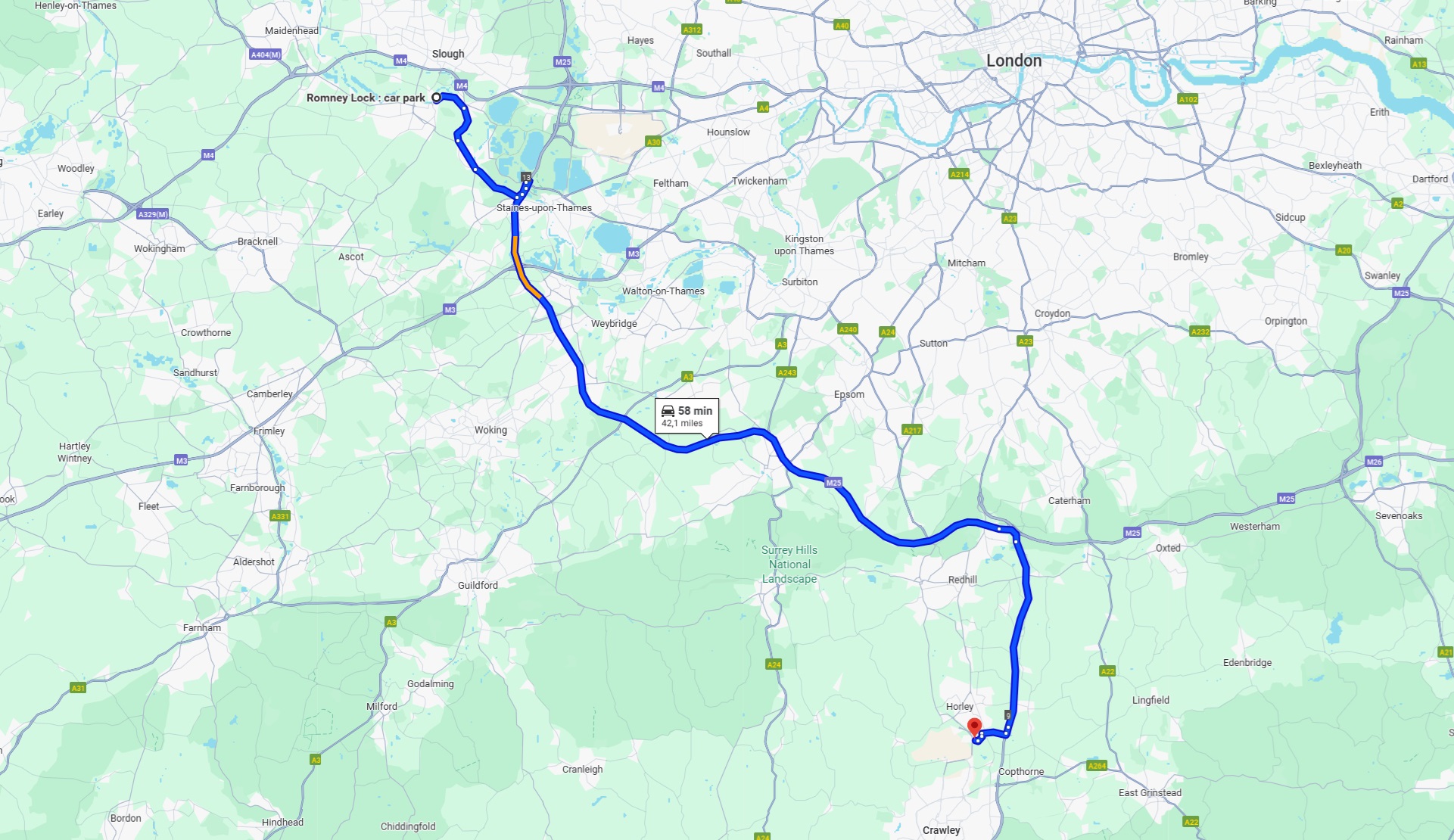 Gåtur til Horley etter at vi hadde sjekket inn bagasje på Gatwick og mens vi ventet på at flyet skulle frakte oss hjem. Gutta ville rekke en Lidl før den stengte, så de løp i forveien. Vi hadde en provisorisk lunsj på en benk ved krysset Consort Way E/Victoria Rd. Samme vei tilbake. Nydelig vær.