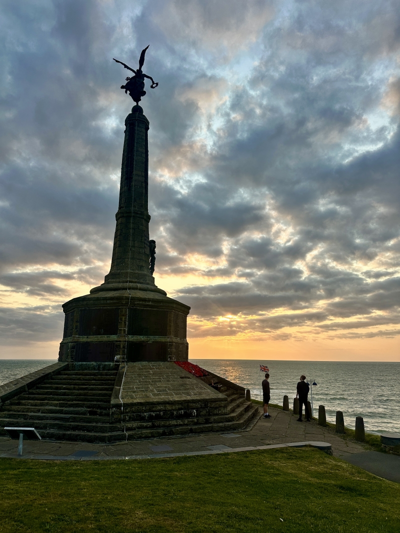 Elias og Iver ved Aberystwyth War Memorial som står foran borgruinene. Det er et minnesmerke etter de som døde under krigen.