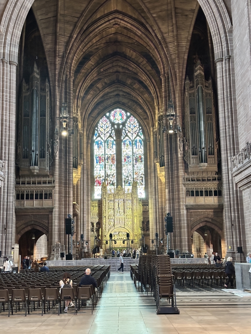 Elias var med litt i starten og fikk med seg statuen av Beatles. Han dro etter hvert av gårde for å trene på Liverpool Harriers and Athletic Club/Wavetree Sports Park. iver og jeg tuslet inn i Liverpool Cathedral og den var enorm. Iver ble mektig imponert og det ble vel jeg også. Etter hvert ble jeg sliten og satte meg til å slappe av mens Iver tok en runde på egen hånd. Vi møttes igjen etter hvert og tok bilen sørover.