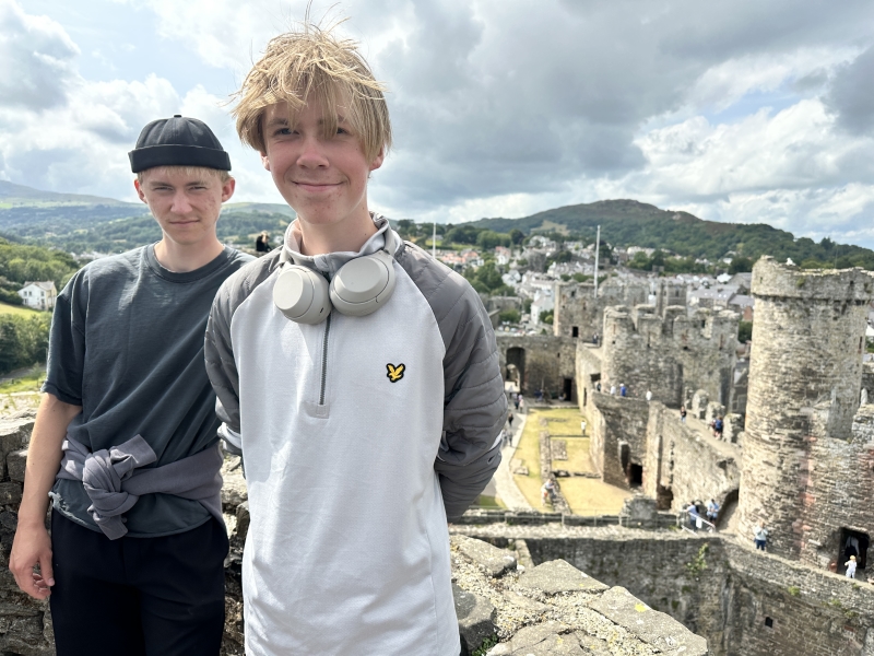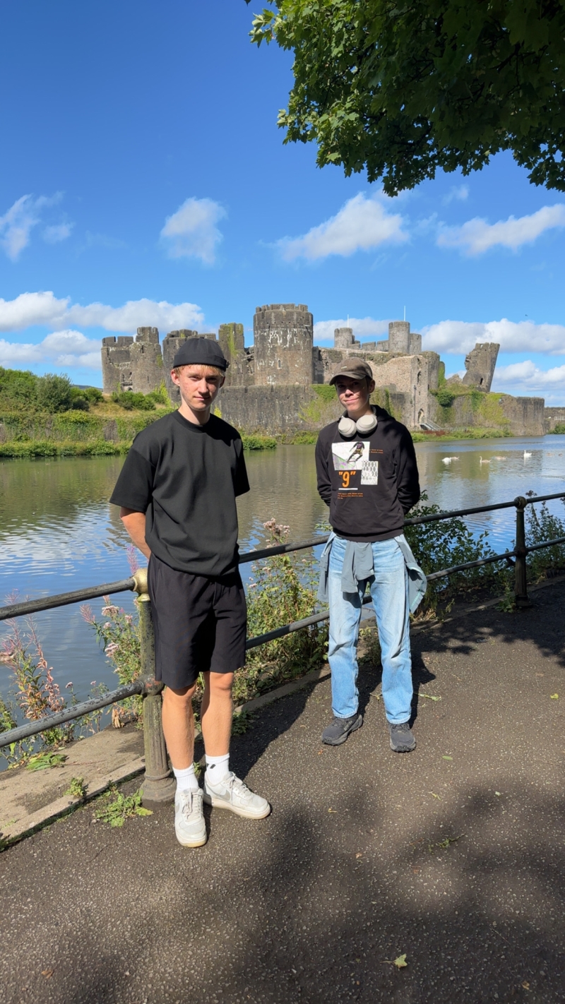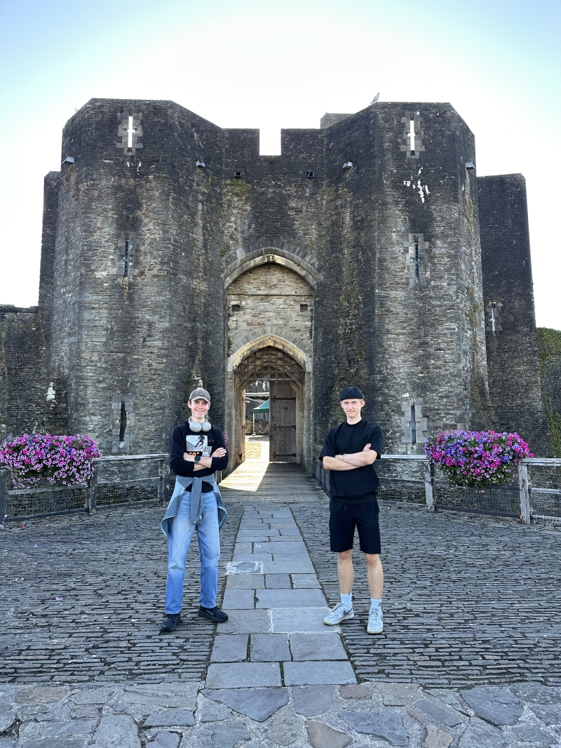Iver og Elias foran inngangen til Caerphilly Castle.
