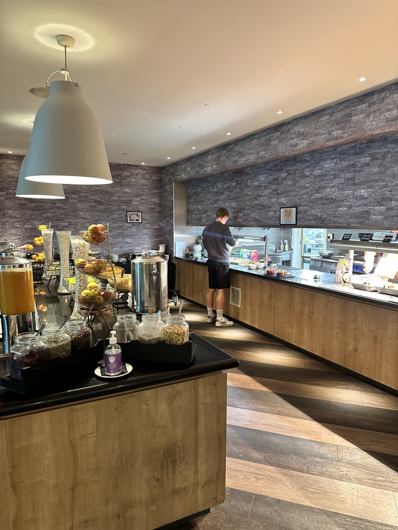 Det ble en urolig natt med lite søvn på de fleste tror jeg. Klokka var satt på 08:00 og det fungerte på et vis. Det ble walisisk frokost på et hyggelig hotell. Terje litt før gutta. Det regnet så vi hadde det ikke travelt med å komme i gang.