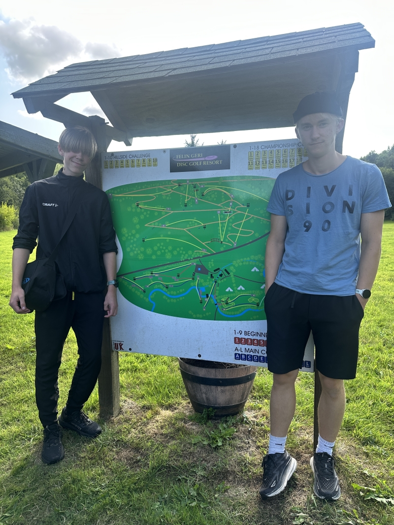Det var en fyldig mann som villig vekke ville introdusere oss for denne frisbeebanen, så vi ble stående en stund å høre på han før vi kom i gang. Iver og Elias kasta mens jeg fulgte med som spotter. Kom til et hull som lå langs elva Afon Ceri. Der havnet det en disk som gutta måtte jobbe litt for å få tak i igjen. Men det gikk fint og vi koste oss gjennom løypa før vi kjørte videre. Flott vær.