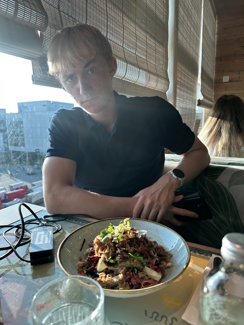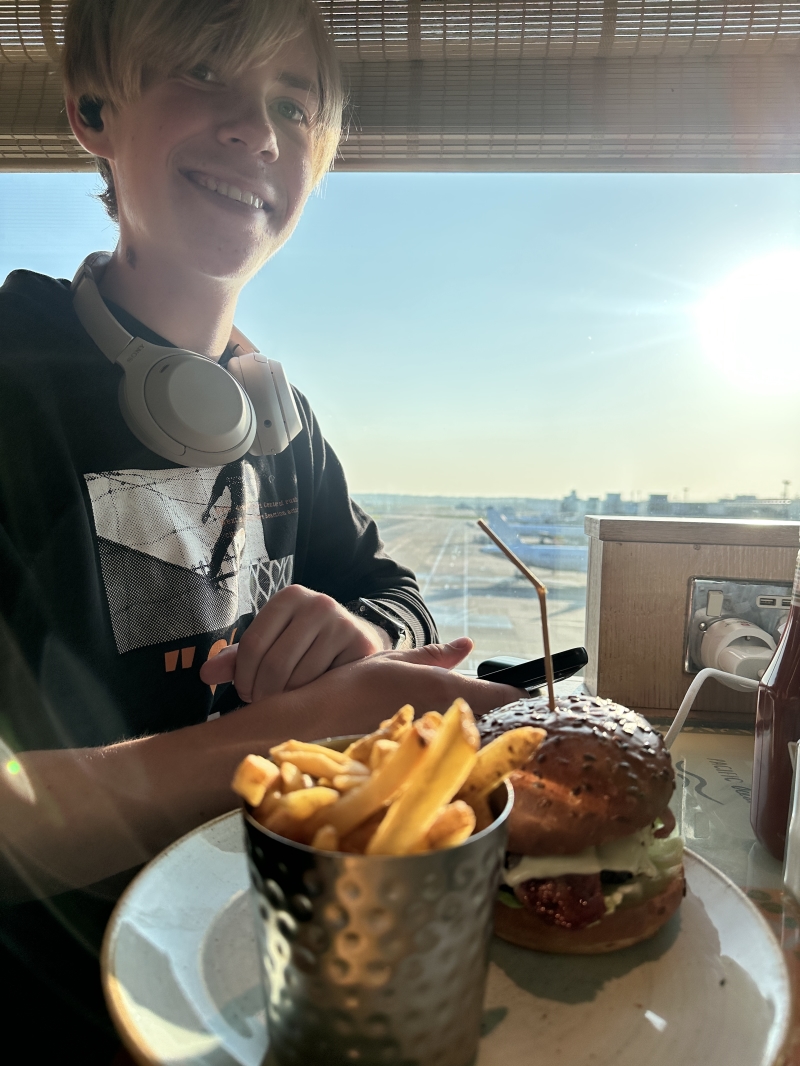 Etter å ha kommet oss tilbake til flyplassen, ble det middag på Wondertree. Wondertree burger på Iver og Terje, Duck & Pineapple salad på Elias. Flyet var ganske presis. Vi hadde sete 7 D, E og F. Landet på Gardermoen 23:55.