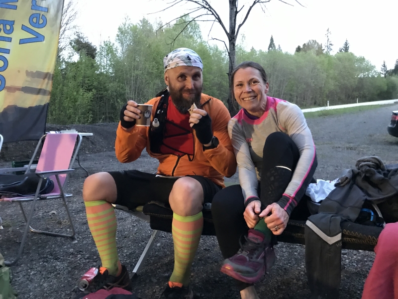 Vi fikk drukket litt, spist noe potetgull og fylt flaskene så var vi gang igjen. Løp over Bybrua og opp stien ved slalåmbakken til Jordbrekkskogen. Og det var her vi nådde igjen dansken, Bo. Vi fikk mye glede av han i midtre delen av løpet. Han var god på å lese GPS og gjorde sjelden feil, så han reddet oss faktisk fra flere blemmer. Henning Lauridsen og Annette Velde Sande nådd oss igjen og vi tok følge fram til rundt 72 km, da vi skulle over Vesleelva. Passeringen av elva gikk greit og vi distanserte både Bo, Henning og Annette. Mørket begynte å sige på da vi kom fram til matstasjonen på Hanekleiva etter 79 km. Her ble vi tatt vel imot med jubel og eksepsjonell service. Jeg spiste i alle fall fire grillpølser. Grillsjef var Einar Hagemann. Jeg fikk Cola, potetgull og noe sjokolade. Line byttet sko og tøy for natten. Jeg turte ikke å bytte. Tanken var at jeg vet hva jeg har, men ikke hva jeg får. Så jeg fortsatte med mine våte Asicssko.
