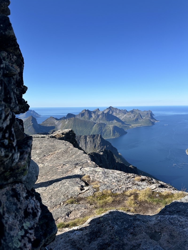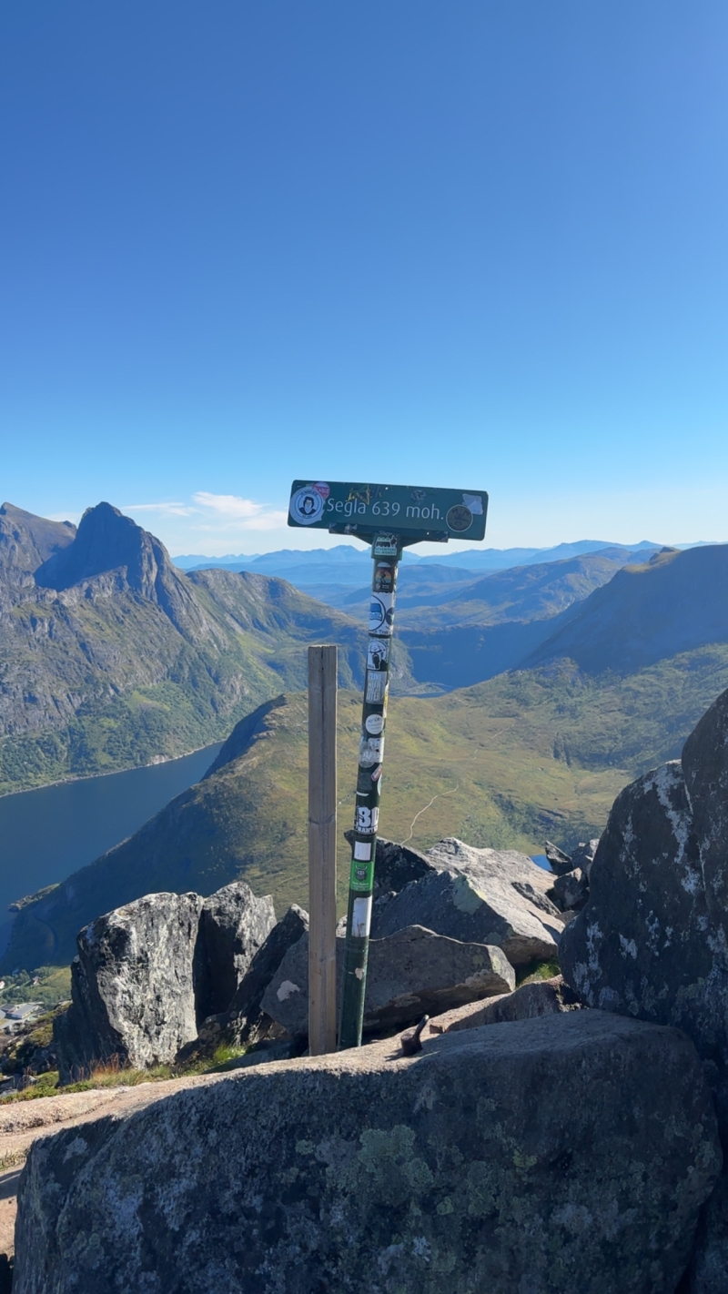 Tok på meg ryggsekken og gikk oppover til et punkt hvor man må velge å gå til Hesten eller Segla. De lokale kaller det Sinsenkrysset. Vi skulle jo uansett gå begge så litt tilfeldig valgte vi Segla først. Kom ganske snart til noe som ble kaldt Brorbua. Han som hadde bygd bua med kone satt der akkurat da, så det ble en hyggelig prat med dem. Vi fortsatt så videre et stykke på tilrettelagte planker før vi kom til løvskog og bratt stigning. Kom så til en liten toppflate kalt Heia hvor vi begynte på den siste, lange, bratte stigningen til Segla. Været var nydelig hele tiden. Fantastisk utsikt på toppen. Etter litt bildetakning og en pause ruslet vi ned igjen til Sinsenkrysset og valgte ruta opp til Hesten. Denne var lettere og mer folksom. Det tok ikke lang tid før vi var på toppen og hadde fantastisk utsikt mot Segla som vi var på for noen timer siden. På andre siden hadde vi like nydelig utsikt mot Inste Kongen og Svartvasstinden. Etter at bildene var tatt ruslet vi raskt ned igjen til bilen svært fornøyde etter en fantastisk tur.